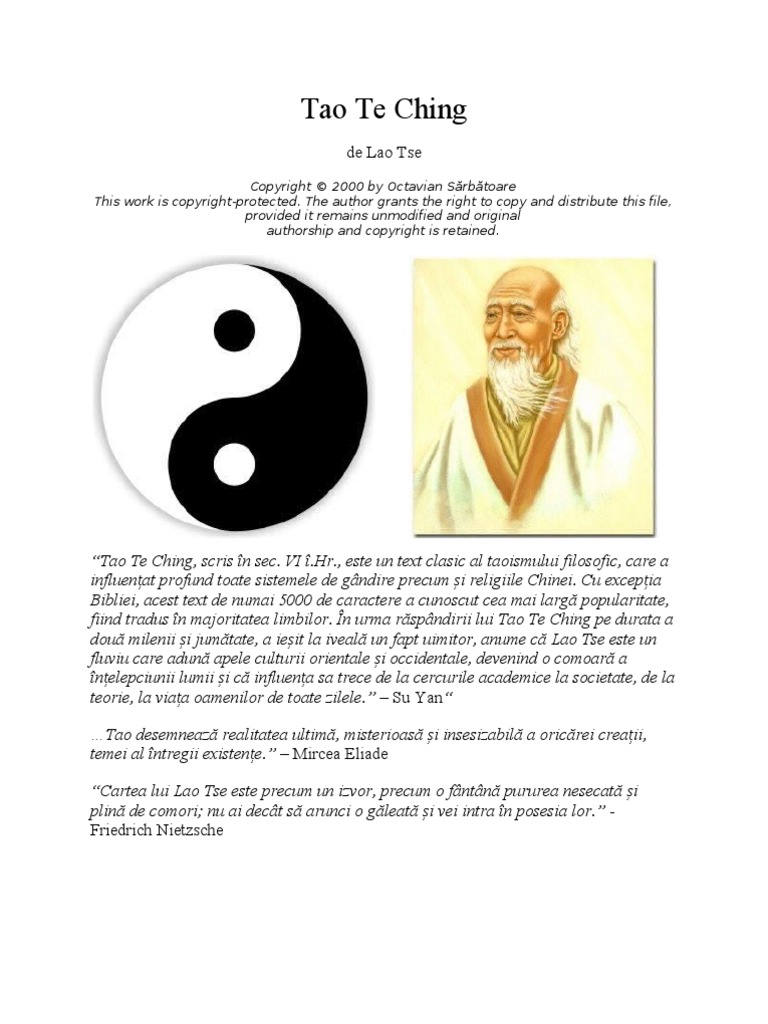 We are glad to make it a free download for everyone thanks to special permission from the publisher of Tao Te Ching. Tao Te Ching în română Cartea despre Cale și Virtute by alt_tu in Types Books - Non-fiction Religion Spirituality şi tao. Mare vitezi la golirea iute vedem.